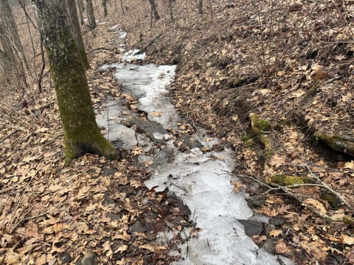 After we ended the conversation, I decided to do something I rarely do–eat a snack while sitting. I typically prefer to eat snacks while I hike, but the setting was too lovely to leave so soon. I heard footsteps behind me on the trail as I noshed on my protein bar. I exchanged peasantries with the young man making them while he picked his way through the tangled limbs reaching over the trail–damage from the recent ice storm. His name was Dylan. He carried on, and I suspected I’d never see him again, given how young and fit he appeared.