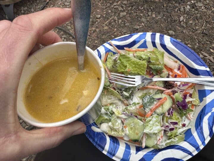 The chicken noodle soup he’d made was truly the best I’ve ever had. Pretty sure it had as much butter as broth, and I ate two cupfuls along with a huge plate of salad (fresh food is the BEST on trail!). Fresh Ground was in full form, sharing stories of his life and peppering us with questions. He couldn’t remember my name after I told him, but when he learned I’m a retired vet, he dubbed me “Dr. Doolittle.” An alternate trail name (which I love!). Max leaned over to me while I ate and said, “You’re getting to experience him in a way not everyone does since it’s just the two of you. If there were lots of people here, he wouldn’t be sharing as much.” I felt very lucky for that and to be in Max’s company for the second time in a day.