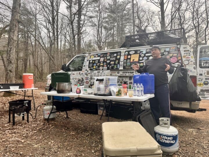 Dylan eventually arrived and asked if anyone had headed out to Gooch Gap. Max had informed us that the legend trail angel, Fresh Ground had set up the Leap Frog Cafe, and was serving up dinner until about 6 p.m. No one had made the 2.5 mile round-trip “bonus mile” trek, but I’d been thinking about it nonstop since my arrival. It would be such a treat to meet Fresh Ground, someone I’d heard about for years. It was luck if thru hikers had the opportunity to take part in one of his iconic meals, including grilled cheese, banana pancakes, or even french press coffee. But 2.5 miles….it felt like a long way to walk at the end of backpacking over twelve miles that day. “Fuck it, I’m going,” Dylan exclaimed after no one seemed to be taking the bait to join us.