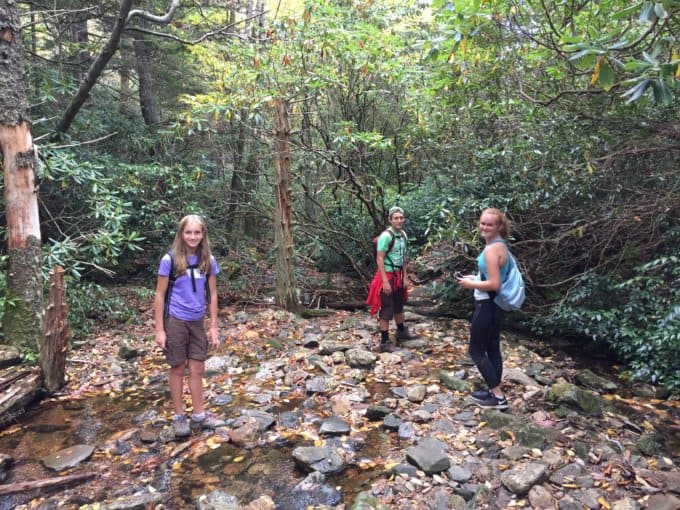 The hike stays above 5000 feet, soon traversing through an open meadow which, at this time of year, was a bit overgrown but passable and the trail easy to stay on. At the 1-mile mark, the trail becomes a bit more wet and boggy and crosses a tributary of Bubbling Spring Branch, the perfect rest stop for kids to hunt for salamanders and crayfish. Both species are bioindicators of stream health, and given how quickly the kids found them, my hope is that this water is in relatively good shape.