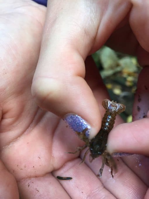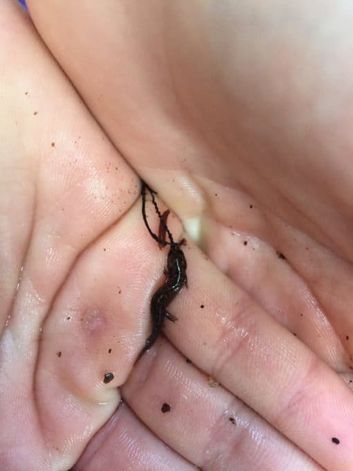 - Paige’s tiny find (it’s better to pick up salamanders with a clean plastic bag, but we did not have any). We put this one back in the water promptly though, as everyone should.